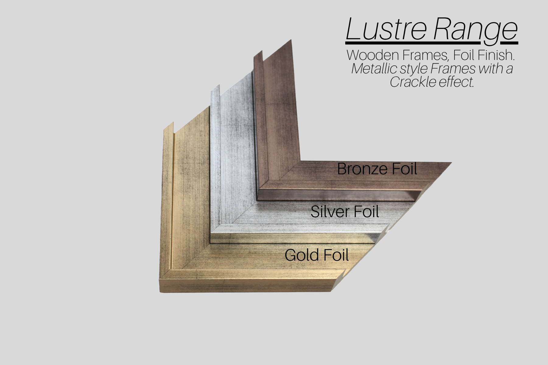 These frames are Wooden frames with a Gold Colour foil. These Frames have a metallic style with a crackle effect finish. These are made from an obeche wood. Hanging Fixtures supplied. Can be hung Portrait or Landscape.