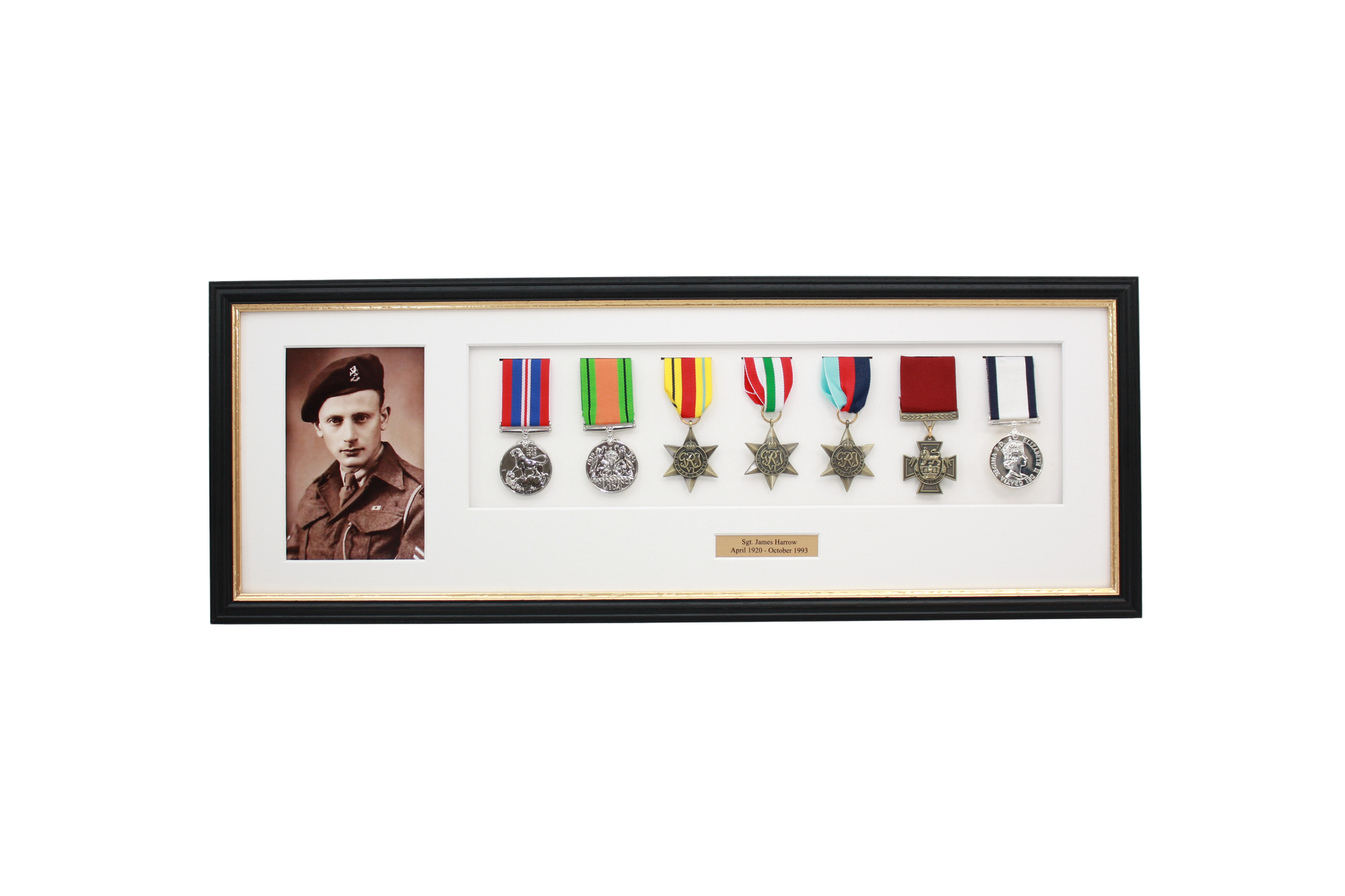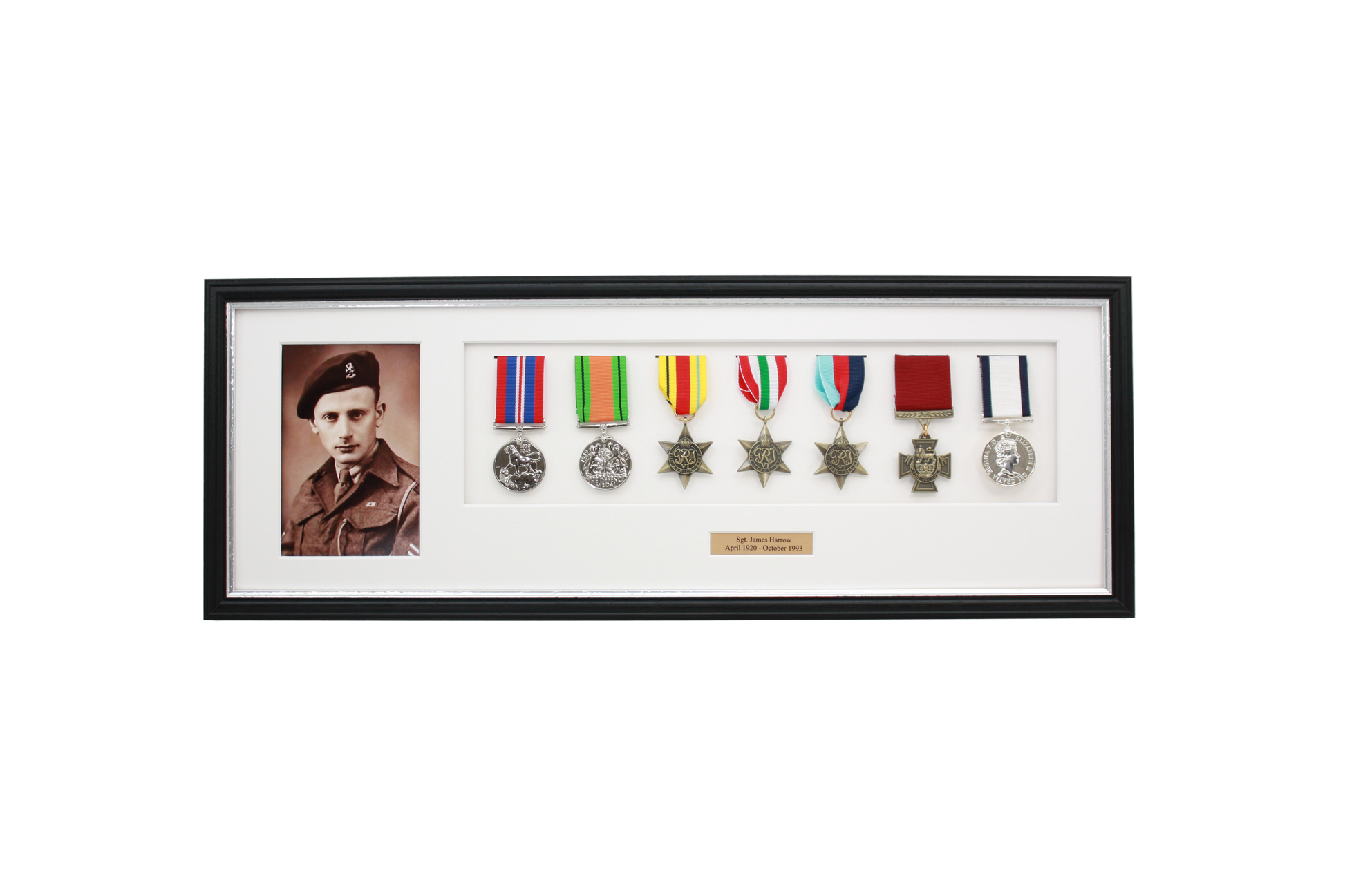 The Perspex size of this frame is 20x60cm, with seven pre-cut slits to hold seven military medals and one aperture to hold a 6x4" photo.